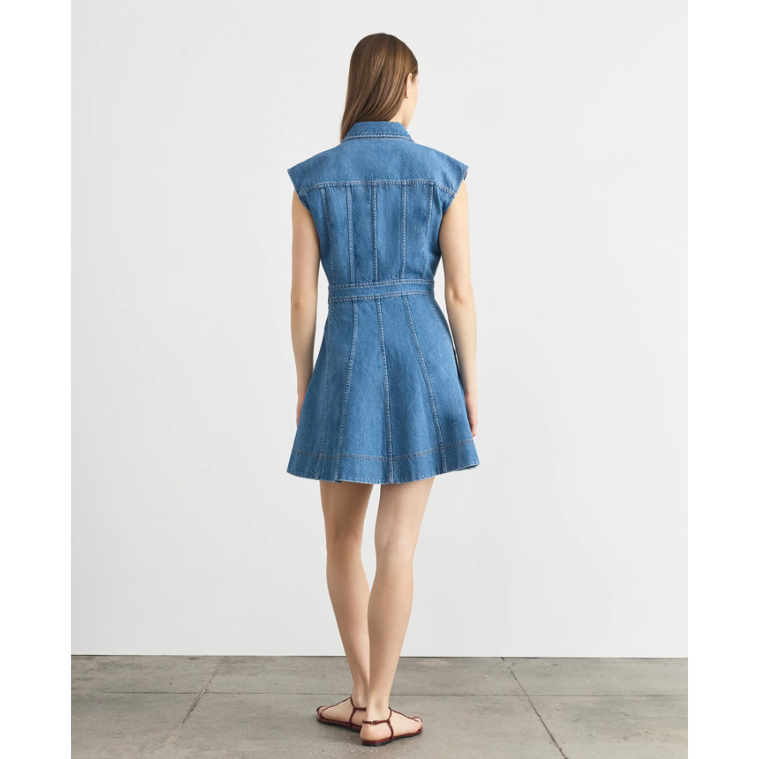 Product Details:• Mini length• Collared neckline• Cap sleeves• Denim• Unlined• Front slant pockets and chest pocket• Button detail at waist• Hidden side zipperFit Details:• True to size• Franci is 5’10” and wears a size 2• Dress is 34.5" long from high point shoulderMaterials & Care:• Self: 100% Cotton• Lining: 65% Polyester, 35% Cotton• Dry clean only