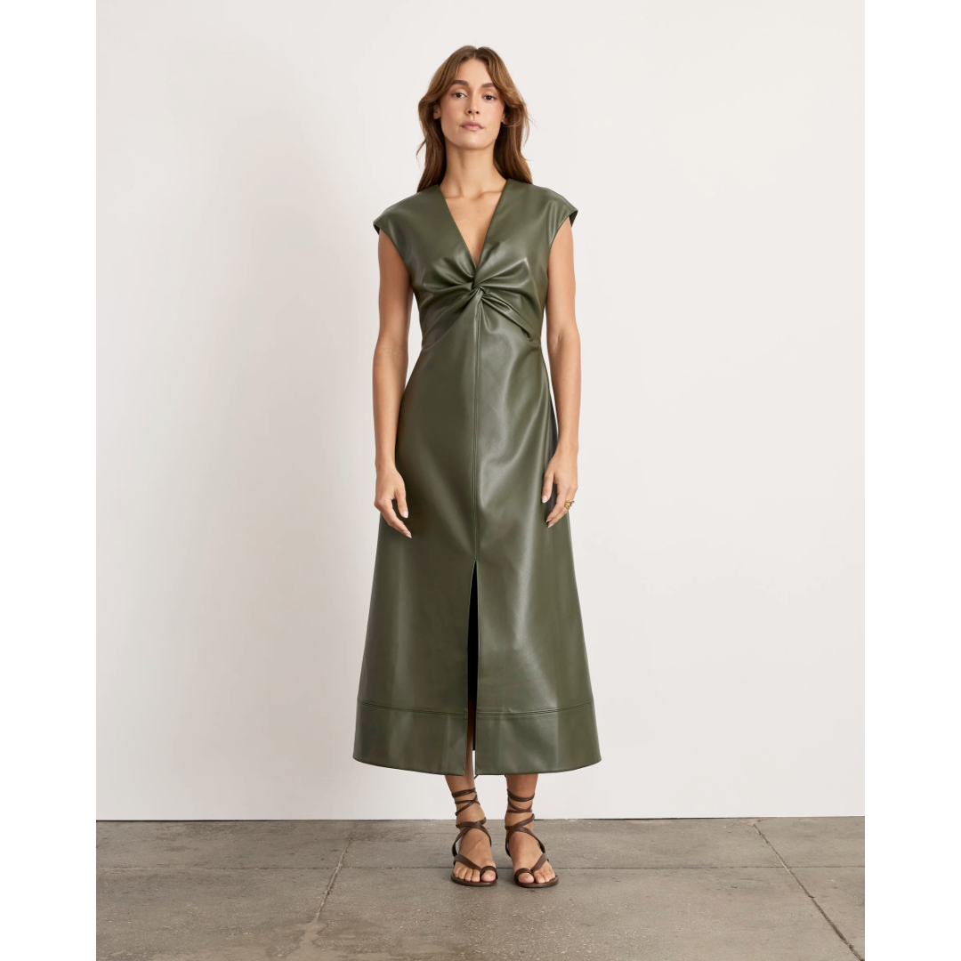 • Designed in a stretch vegan leather, the Tracy Dress is a standout midi dress for the holiday season.