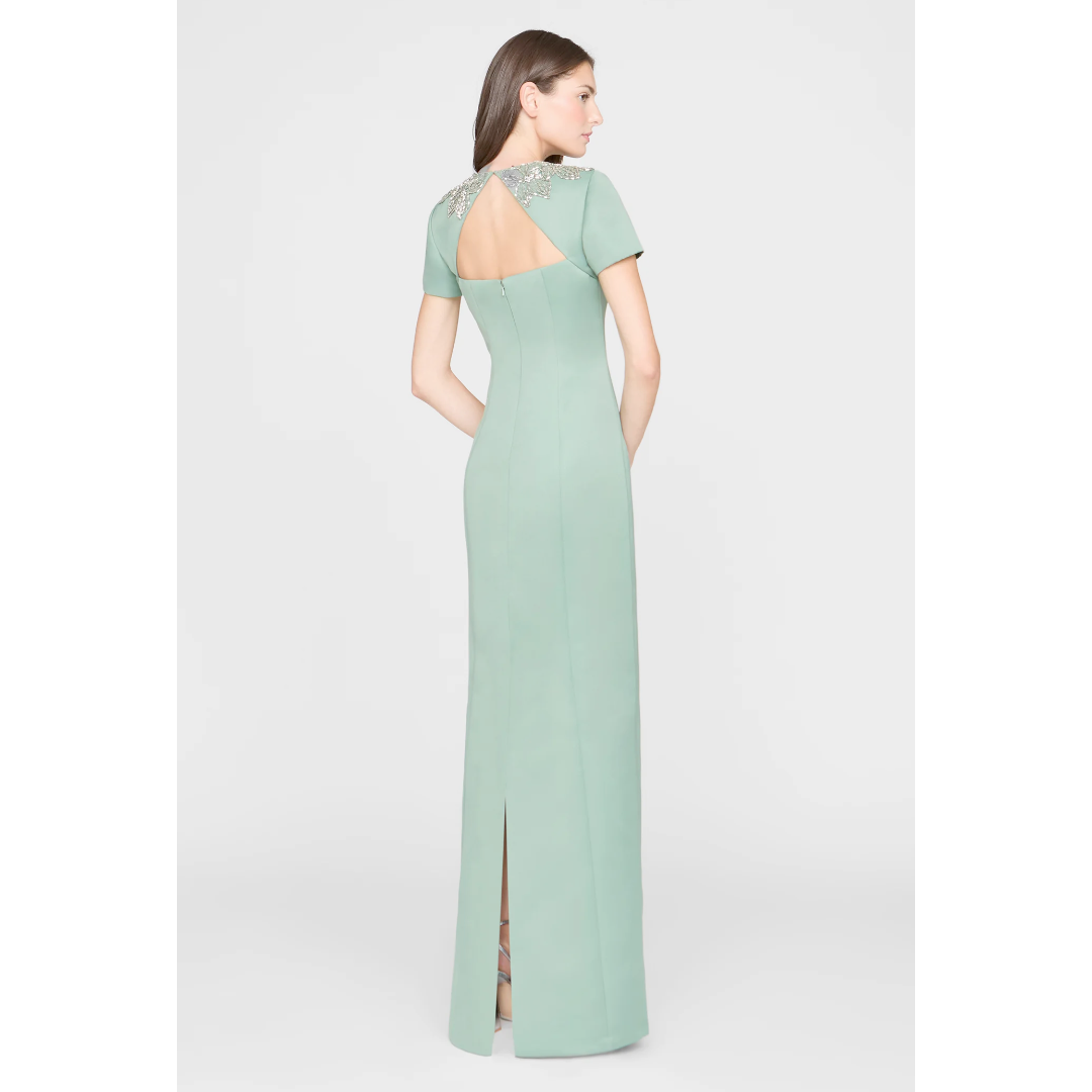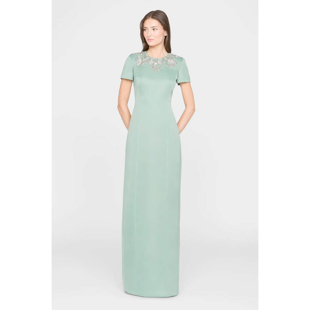 Sleek duchess satin gown in a fresh hue with a clean, subtly luminous finish. Hand-embroidered floral beading frames the neckline like fine jewelry, finished with a modern back detail for black-tie weddings and formal celebrations.