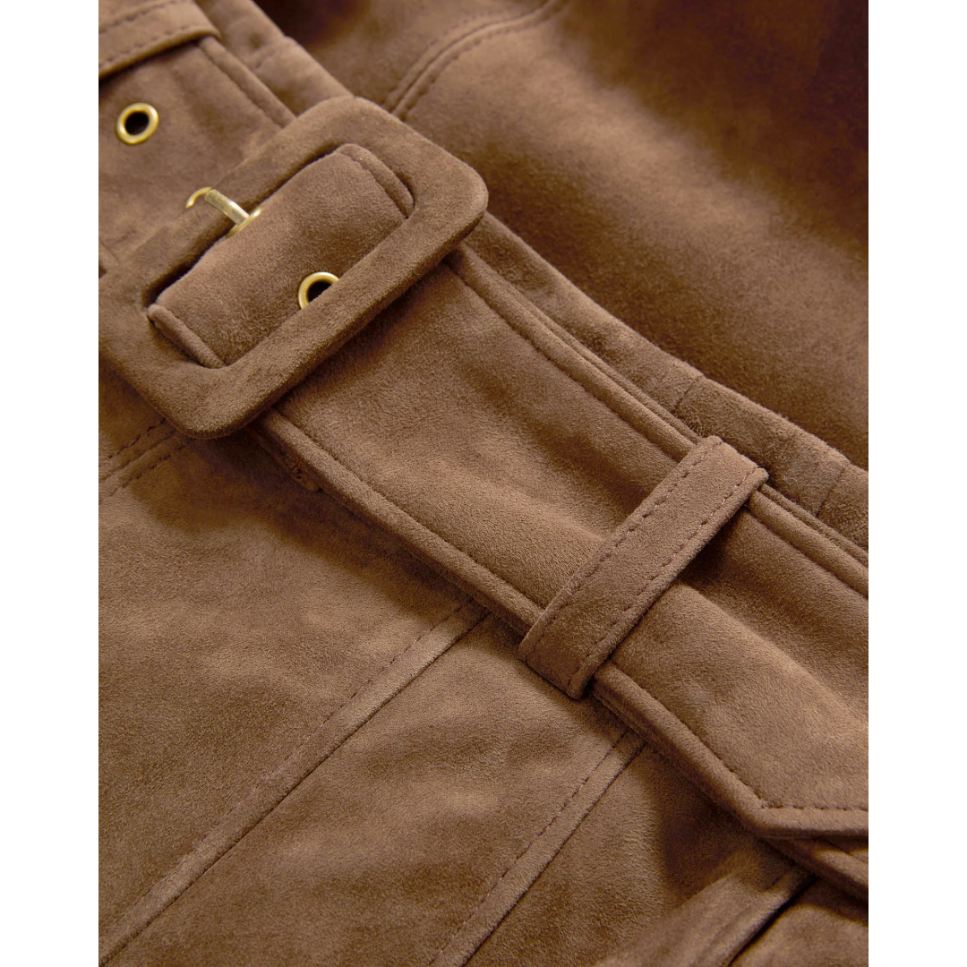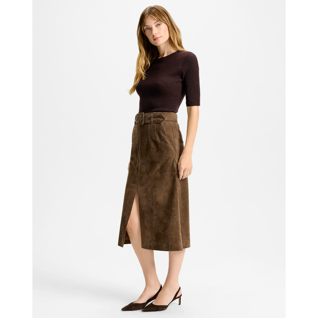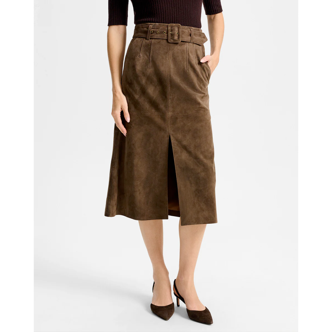 The suede skirt, perfected. Crafted from 100% soft lambskin, the Alexie A-line midi skirt features a high Hollywood waistband to define shape, finished with a matching belt with a suede-covered buckle to further accentuate the waist. It’s finished with side slant pockets and a center-front slit for ease. Style this brown suede skirt with a simple tee or knit to elevate the everyday.