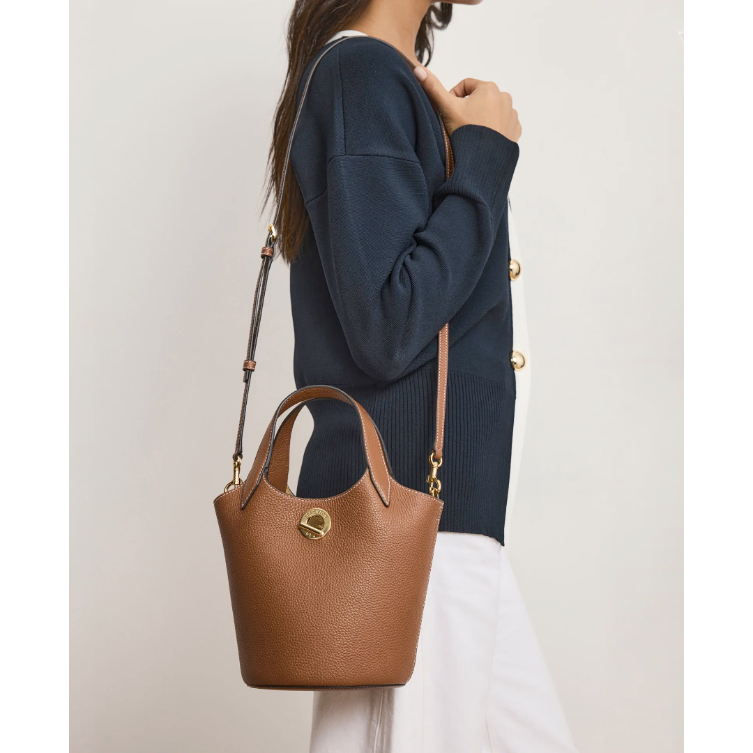 Defined by a minimalist, refined silhouette, the Anchor bag is your go-to for everyday essentials. Crafted from soft tan pebbled leather, it features double top handles for effortless carrying, while an adjustable, removable strap offers a seamless transition from tote to crossbody bag. Structured sides and a flat base allow it to stand upright for easy access. Finished with gold toggle hardware for a polished look, an interior pocket keeps smaller items secure. Perfect for week-to-weekend—just grab and go.