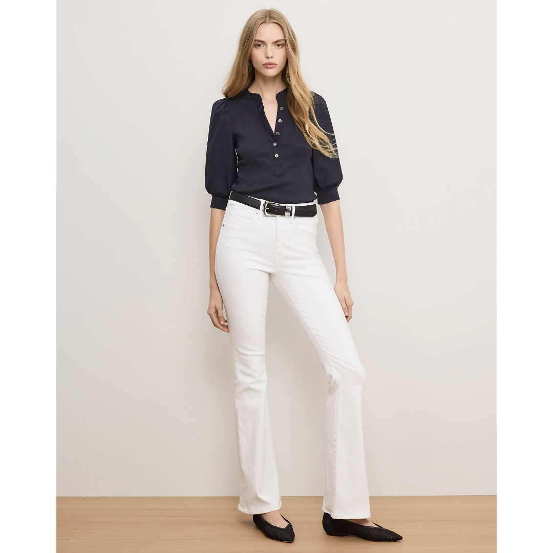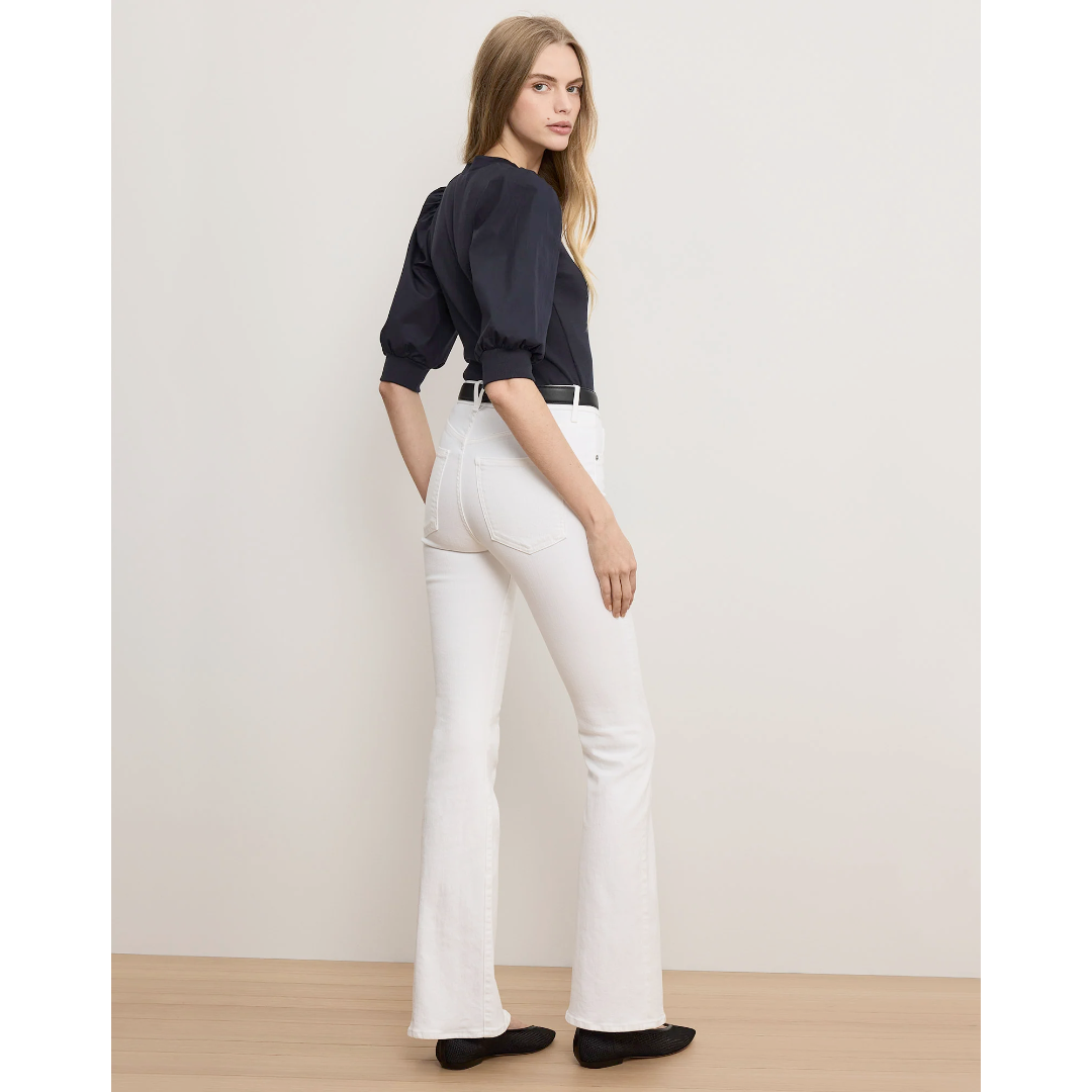 In our fresh white wash, the Beverly jean features a high-rise waist that is fitted through the hips and thighs with a subtly flared leg. High quality stretch denim offers a flattering look with a flexible fit. Tuck in any of our tops and add sky-high heels for an elongating silhouette.