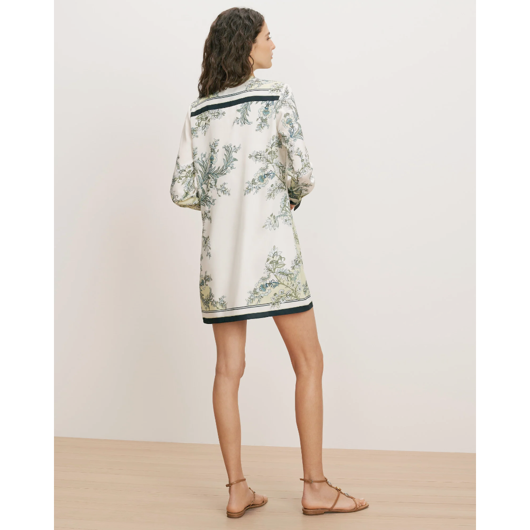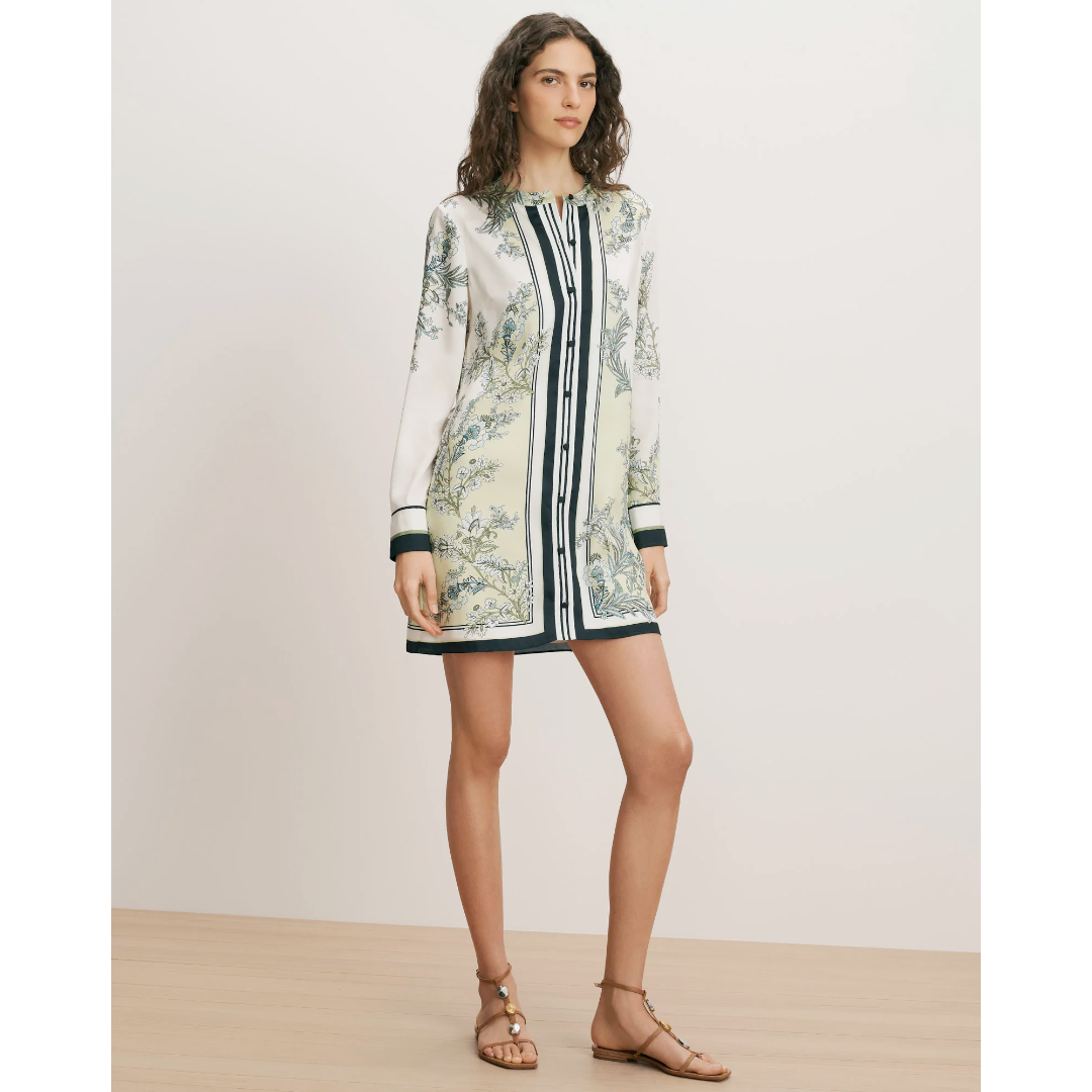 An ultra-feminine take on the classic shirtdress. Cut from a soft, silky twill, the Carstowe mini dress features a fluid, relaxed silhouette and a lush, scarf-inspired botanical print in ivory, pistachio green, and black. Black-and-white stripes along the trim and yoke add graphic contrast while a clean band collar completes the look. Wear this long-sleeve dress it day to night—just swap flats for heels and add a bold lip.