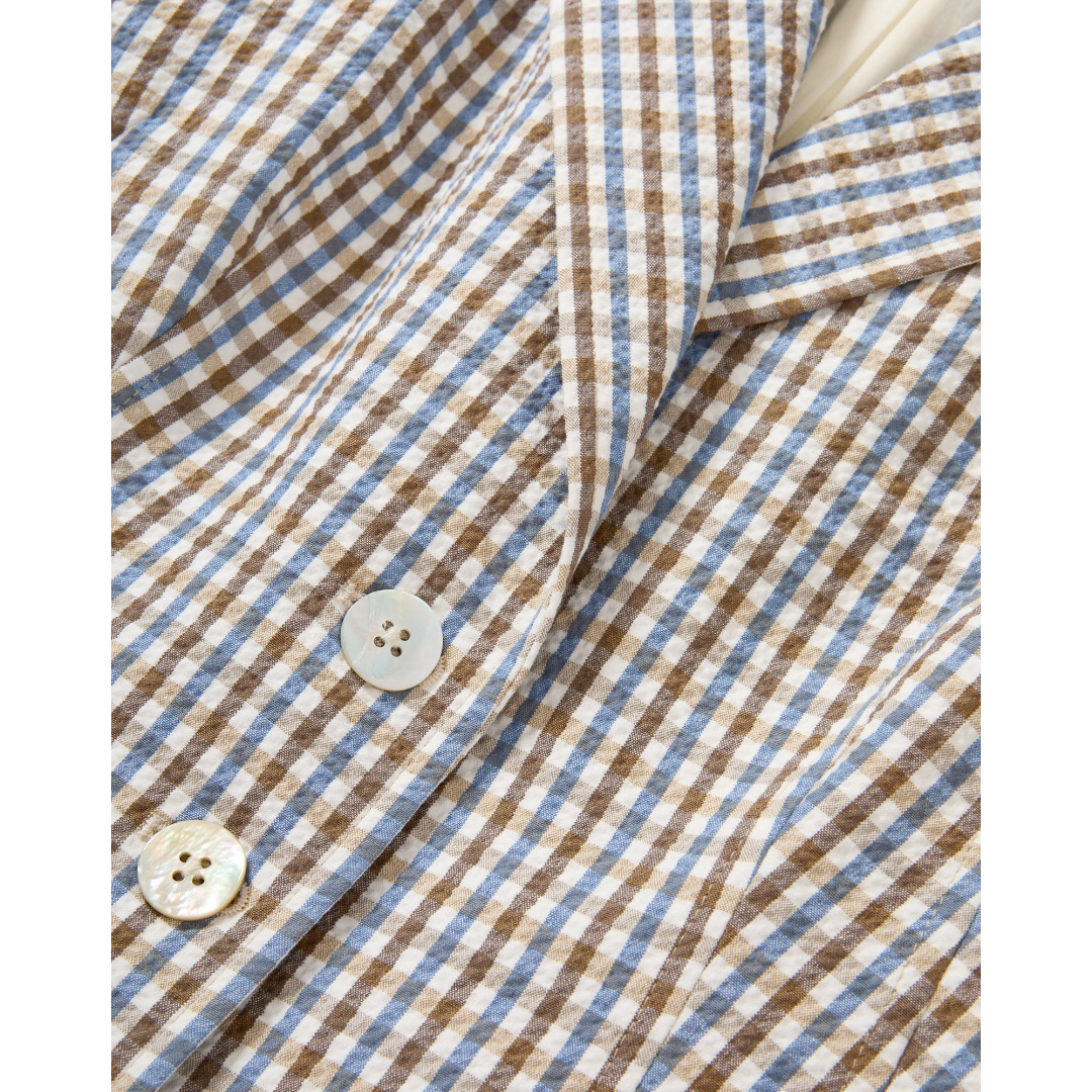 Warm-weather tailoring, perfected. Crafted from premium stretch cotton seersucker in brown-and-blue gingham, the Costa vest features a slim, elongated silhouette with a wide peak lapel. Darting at the back cinches the waist, while diagonal welt pockets underscore the clean lines and streamlined shape. It pairs perfectly with the coordinating Arte pant for a chic spring set.