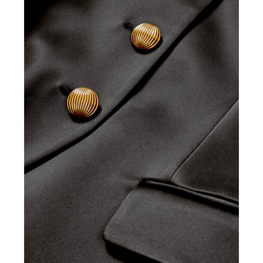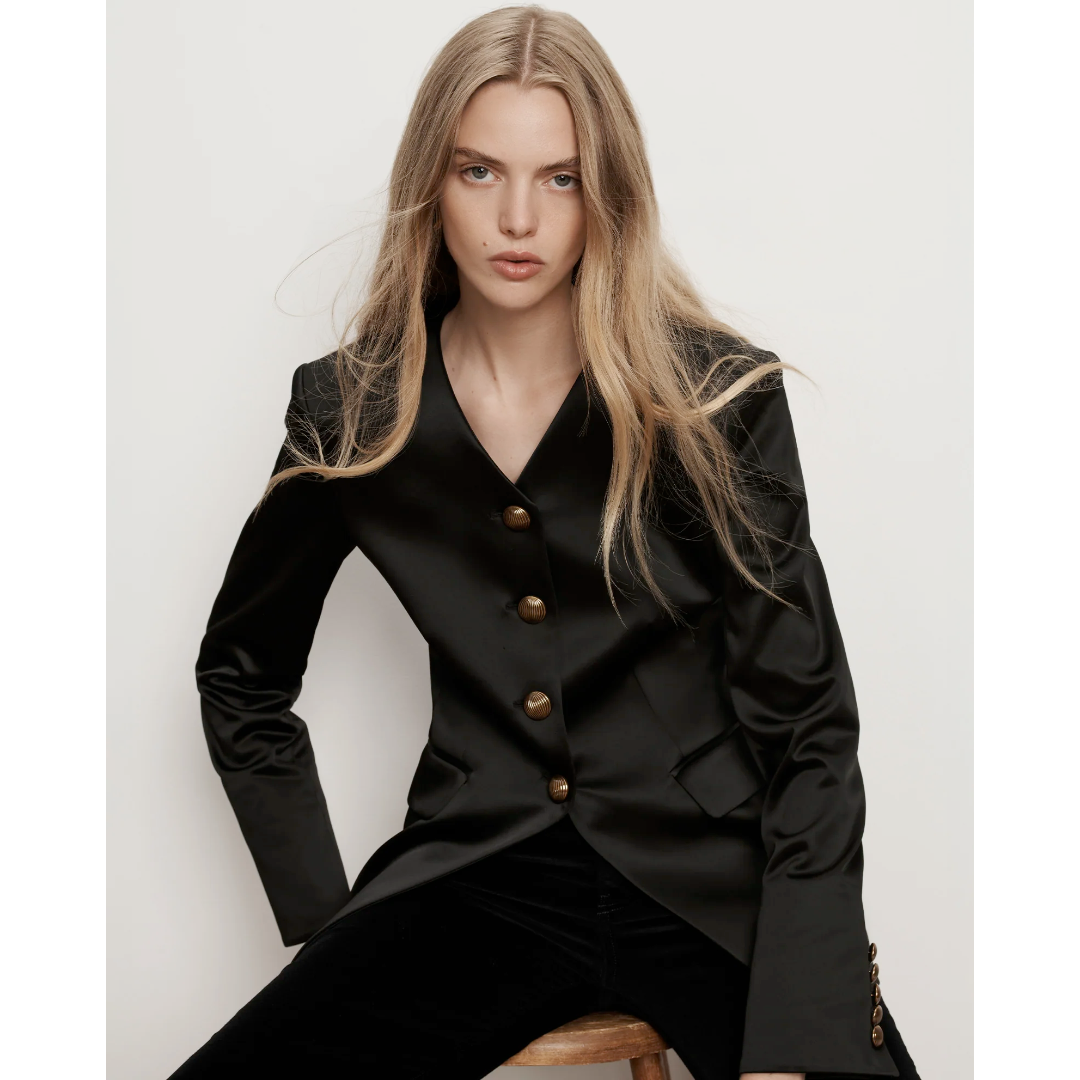 Sleek and sophisticated. Expertly tailored in the USA from premium Italian satin, the Cynthia is a black, single-breasted blazer featuring a darted bodice and angled hem for a waist-defining fit. A collarless V-neckline, gold statement buttons, and front flap pockets add a polished finish. Style this jacket with a slim pant and heels for the perfect desk-to-dinner look.