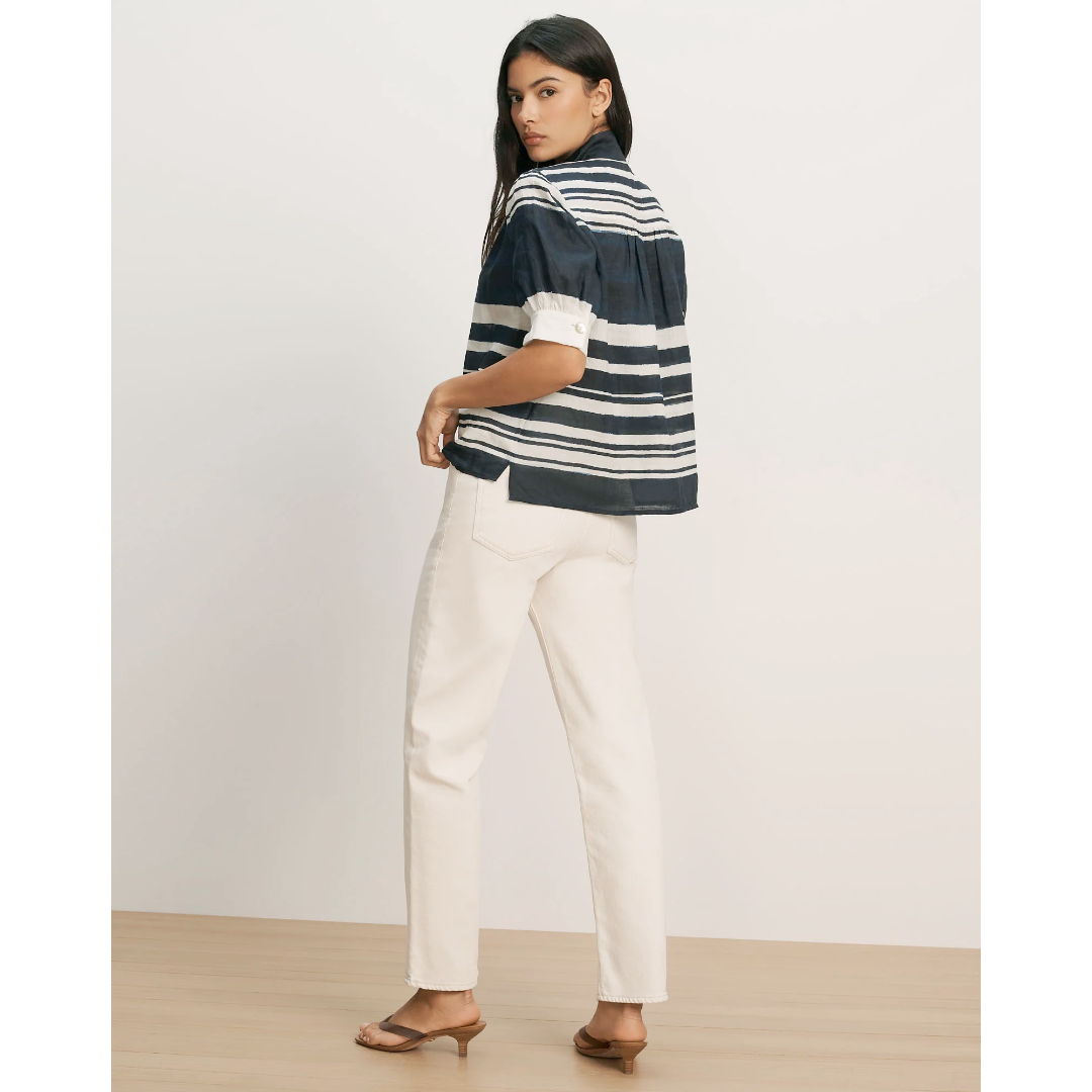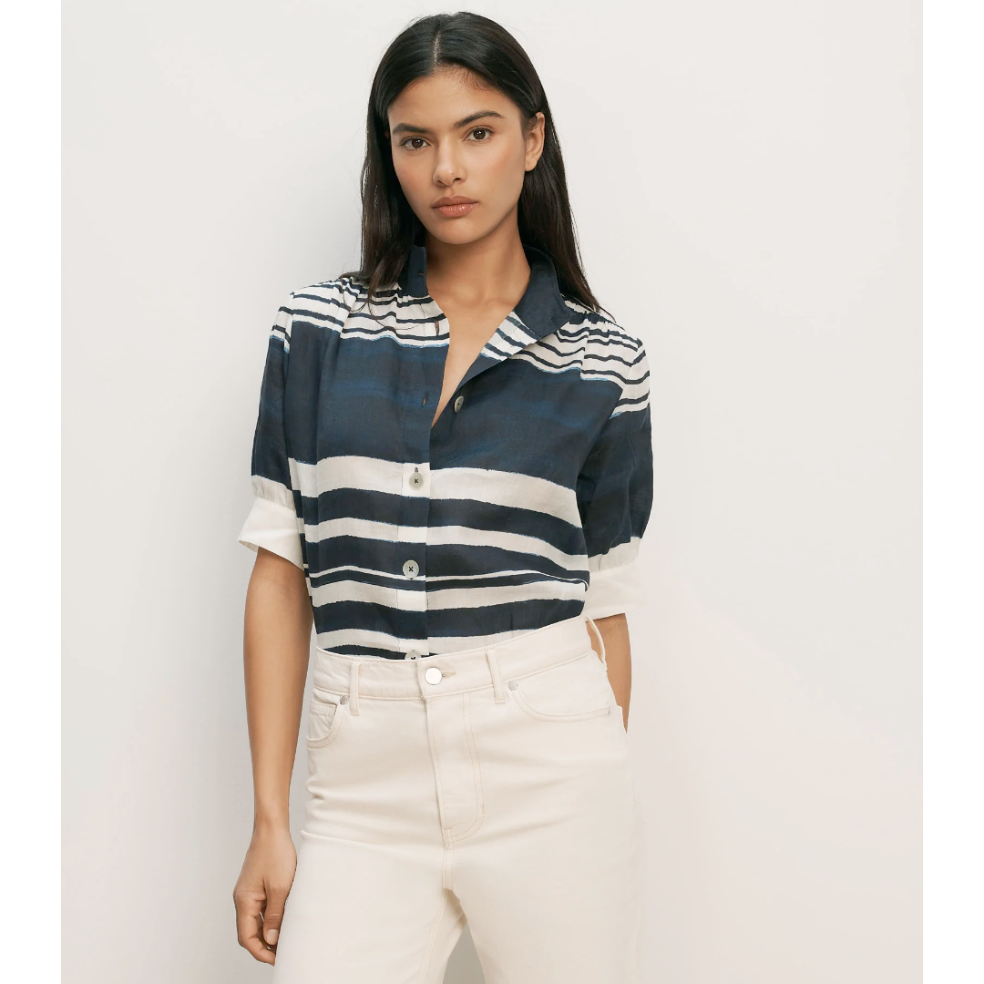 Expertly tailored from lightweight, breathable ramie, the Hollandale button-down shirt has a soft, lived-in hand feel. Cut for a breezy, loose fit, it drapes away from the body for added ease and features bold stripes with a hand-painted effect. Elongated half sleeves provide coverage while mother-of-pearl buttons add a touch of shine. Wear it with jeans or shorts for an effortless day look.