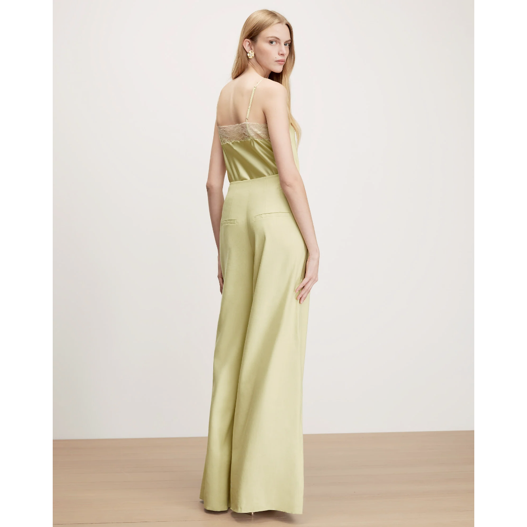 The essential warm-weather trouser. Crafted from Italian stretch-linen twill in pistachio green, the Hoyt pant is lightweight and breathable with beautiful drape. Its high-rise, wide-leg silhouette features elongated seam details at the waist, creating soft, natural pleats. Welt pockets and a hidden hook-and-bar closure lend a polished finish. Endlessly wearable, tuck in a simple tank for easy polish, or style with the coordinating Hartwell vest for a spring take on tailoring.
