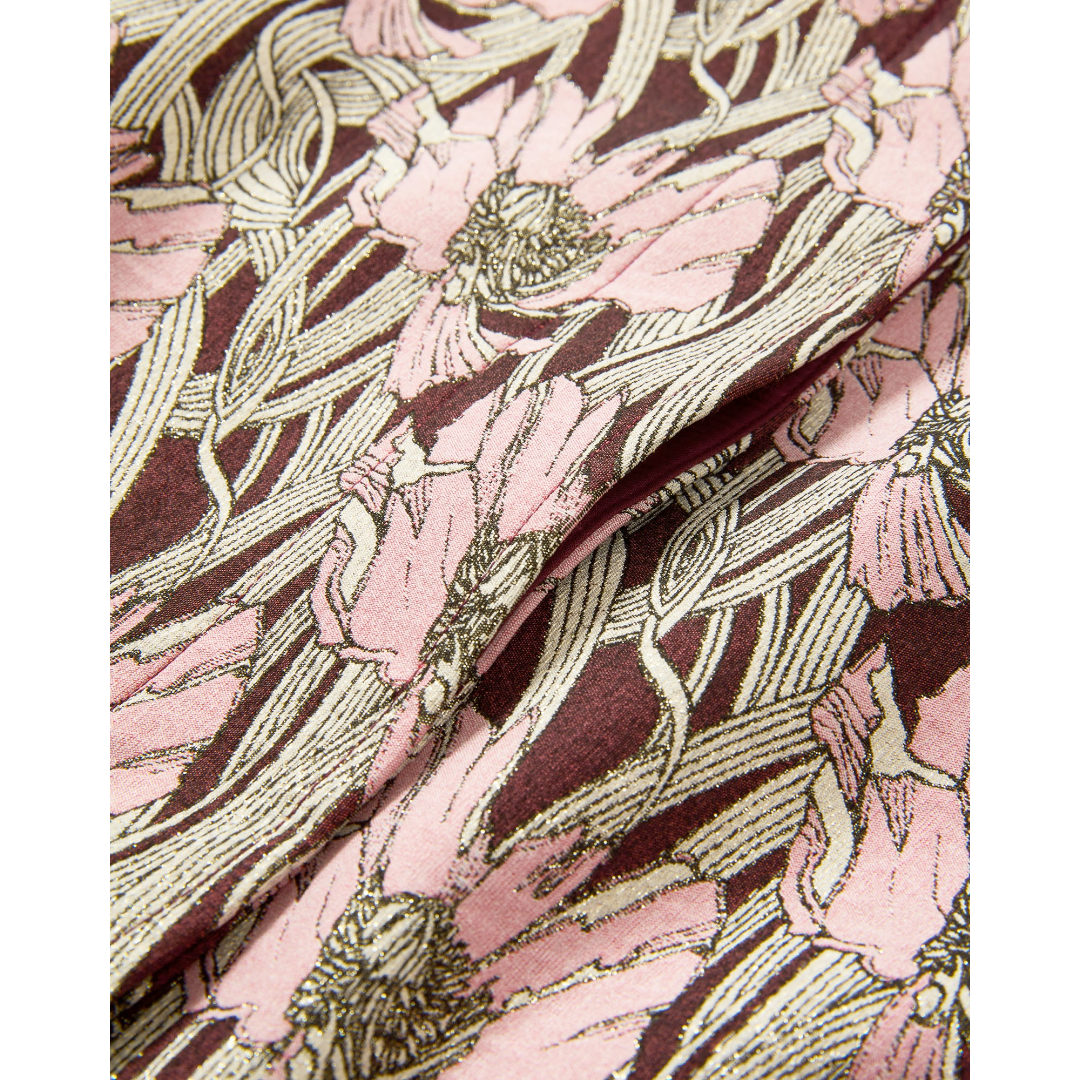 A tailored vest with a sleek, streamlined look. The jewel-neck Jessup is fitted at the waist and gently flares at the hem, finished with a hidden button placket for a clean silhouette. Crafted from a premium tailoring blend, it’s patterned in burgundy and pink florals with subtle metallic threading throughout. Pair with the coordinating Arte pant for a chic matching set, or dress it down with white denim.