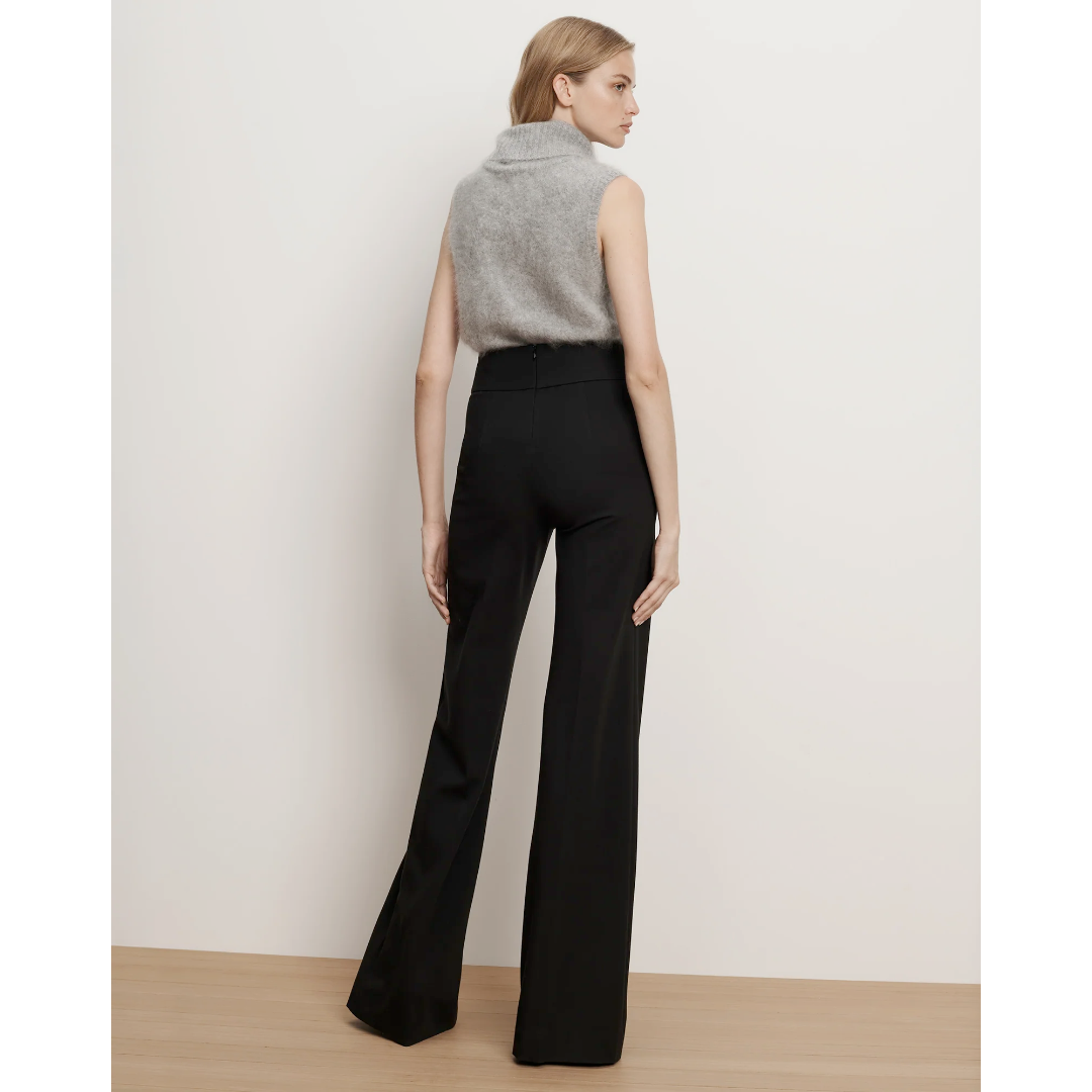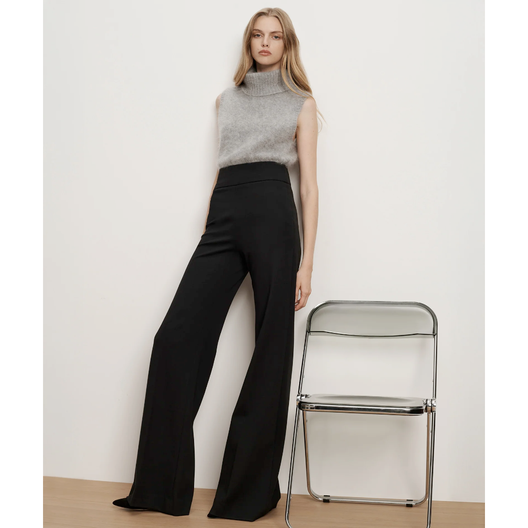 The ponte pant, perfected. Crafted from a smooth, stretch-viscose knit in black, the Kalinda features a super-wide-leg silhouette with a high, three-inch-wide waistband for a sleek, flattering fit. A pressed front crease adds polish and structure, while the invisible back zipper closure ensures a clean finish. Combining the ease of a pull-on pant with the refinement of tailoring, dress it up for work or down for the weekend.