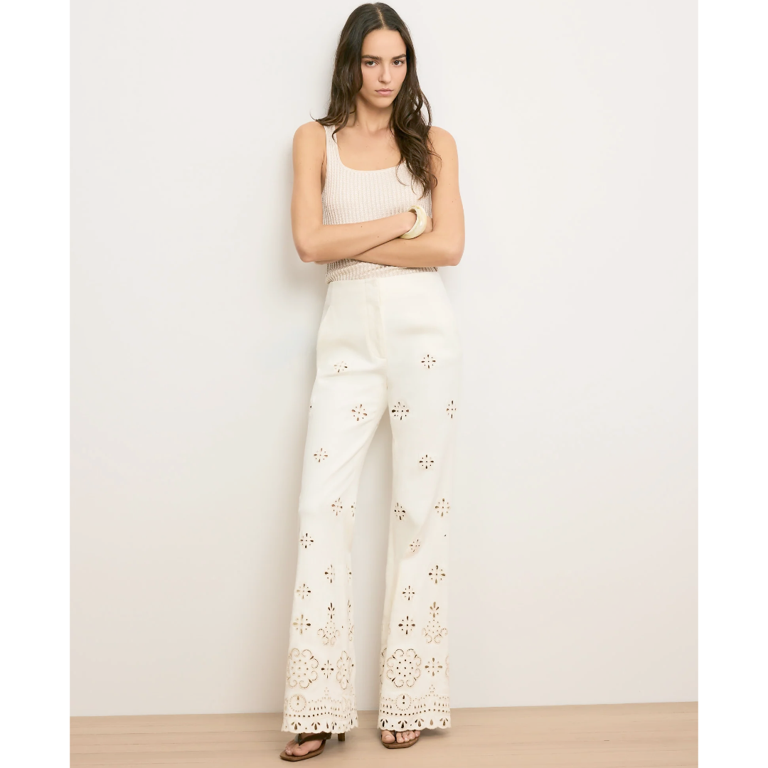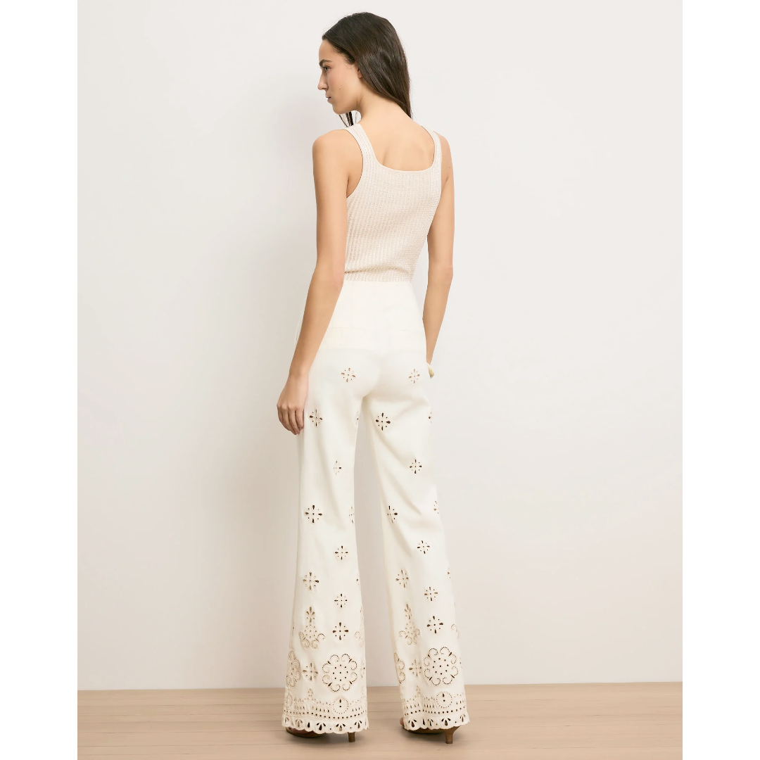 Expertly tailored from stretch cotton-twill in off-white, the Komi pant is defined by intricate custom eyelet details down each leg. Designed with a flattering, high-rise Hollywood waistband, it fits slim through the hips before widening to a relaxed, full-length flare with a scalloped hem. Slanted front pockets complete the look. Style it with the coordinating vest for a chic warm-weather set, or pair with a simple tank for an easy, casual feel.