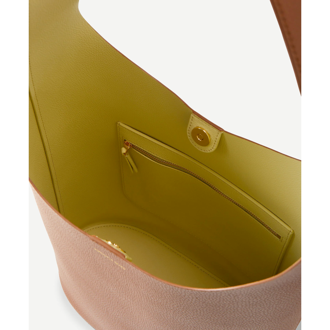 Roomy, relaxed, and modern. The large Loop bag elevates the everyday tote with an elongated silhouette—and a slight slouch for chic ease. Crafted from tan double-faced pebbled leather, it features a clean, finished interior in soft pistachio green, creating an understated graphic element. The flat base allows the handbag to stand upright for easy access; the adjustable strap ensures comfortable over-the-shoulder wear. An interior zip pocket completes the look.