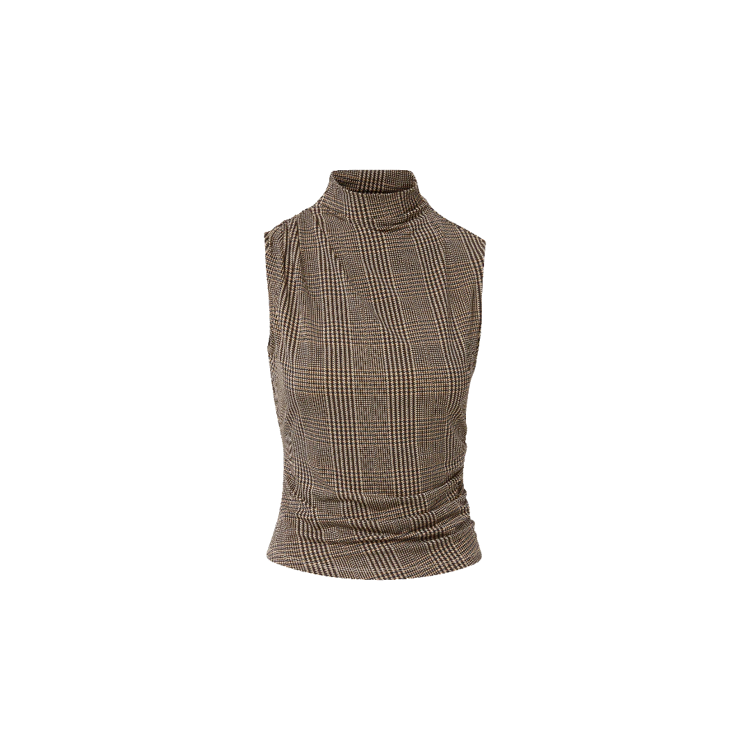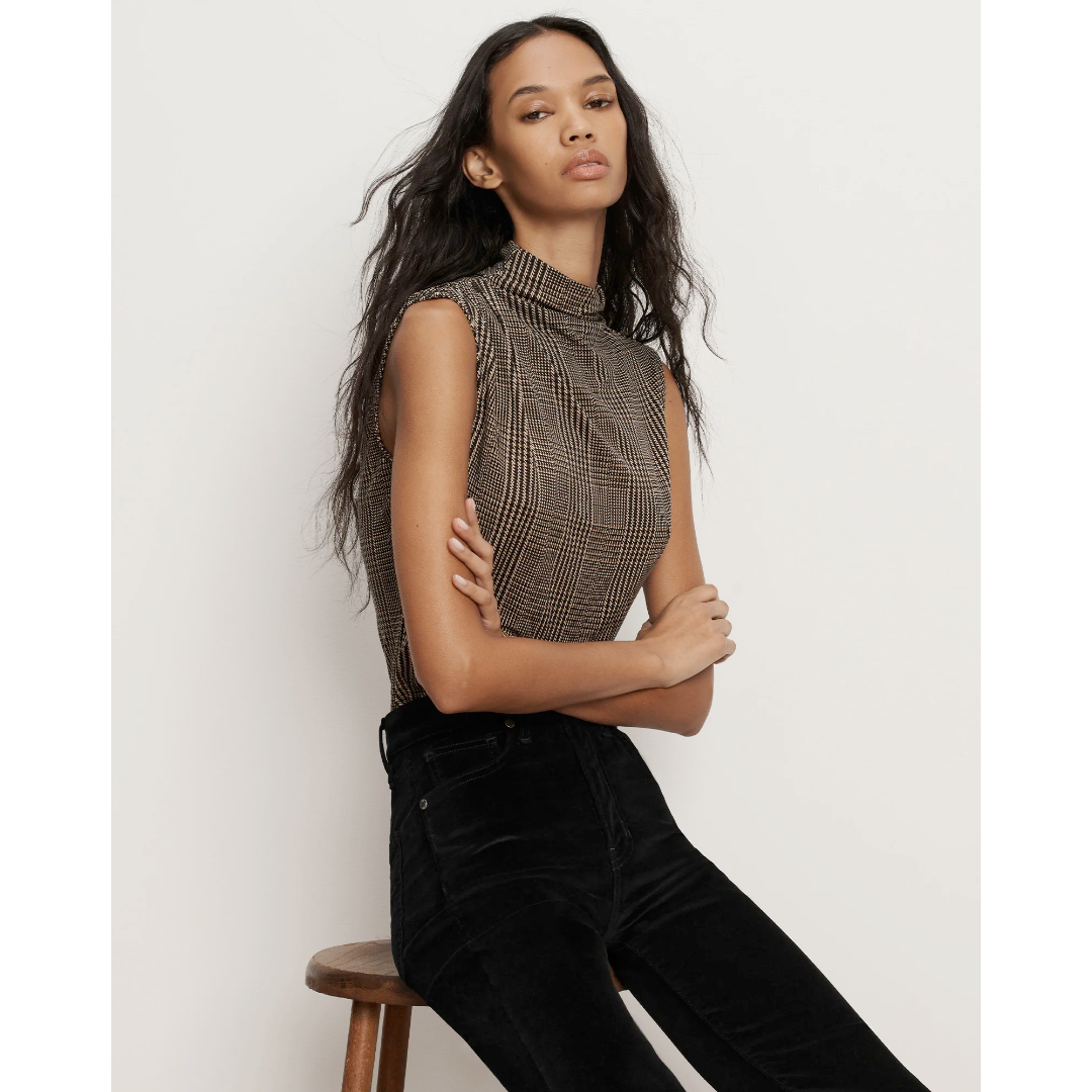 An essential, elevated. Crafted from a soft stretch blend in beige and black houndstooth, the Mylie reimagines the classic tank with a mock neckline and subtle side ruching. Its draped, sleeveless silhouette falls in soft folds, creating fluid, flattering shape. Wear this mock neck top solo with jeans for a polished daytime look, or layer under a tailored suit for the office.