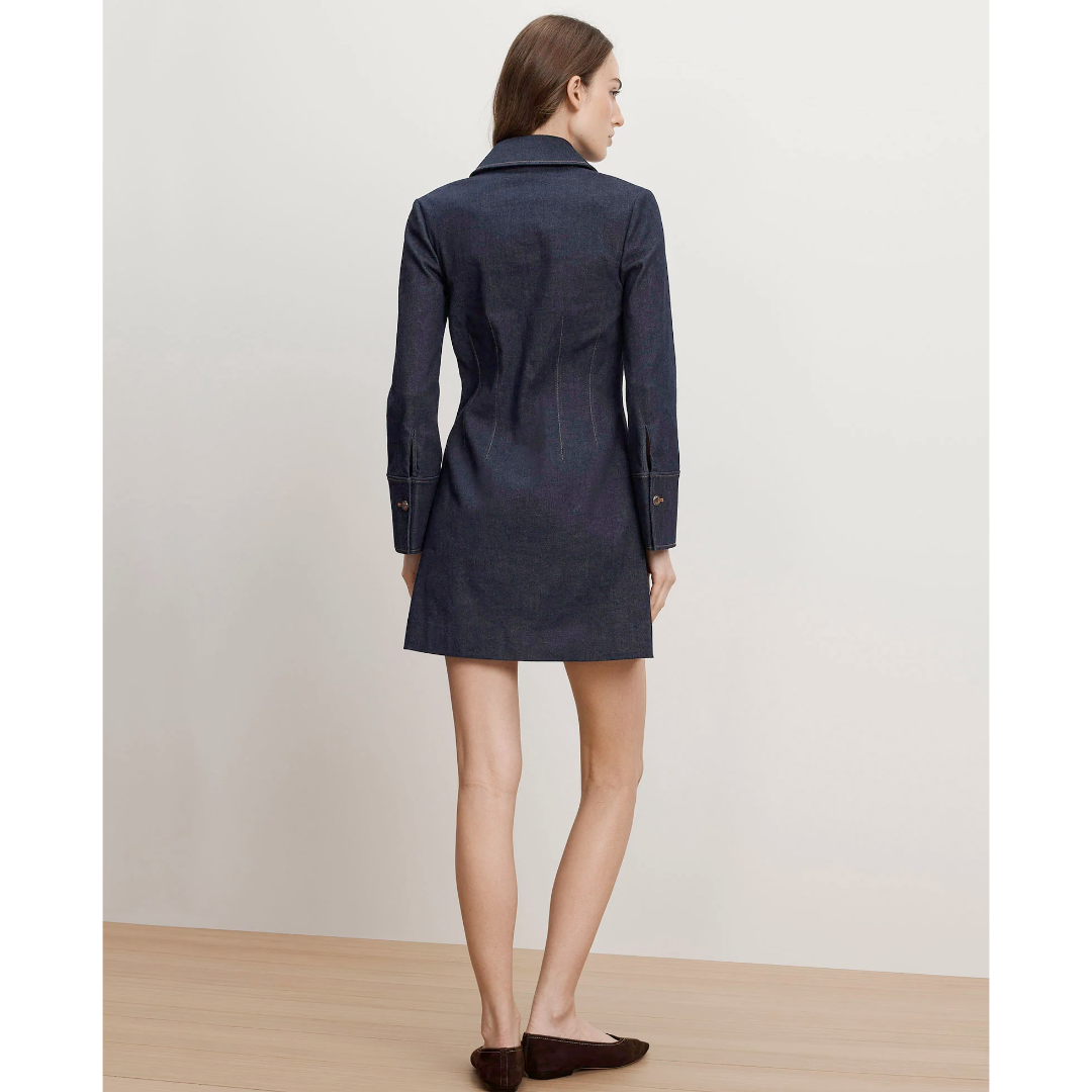 A refined take on the denim dress. Crafted from our signature Stretch Denim Tailoring in dark blue, the Raymond features a flattering fit-and-flare silhouette, accented by angled bodice seams to define the waist. A collared split neckline, buttonless half-placket, and subtly flared long sleeves add a polished finish. Ever-versatile, it pairs with tall boots, heels, or flats—dress it up or down with ease.