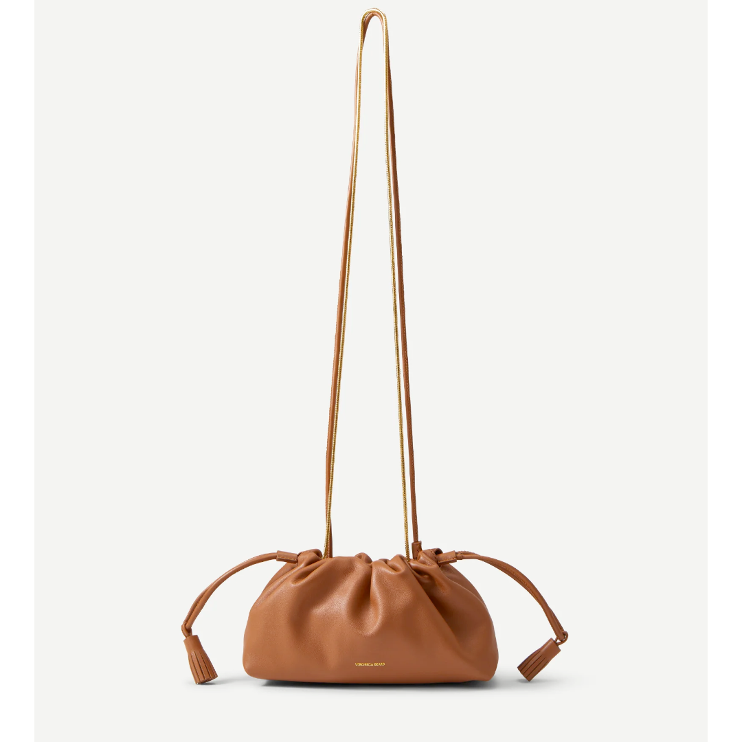 A petite take on our original Stash bag—that's still roomy enough to fit the largest iPhone. Crafted from smooth, supple tan leather, this pouch bag features a softly structured silhouette with a gathered, cinchable top, finished with tasseled drawstrings. Two straps—one in leather, the other a gold snake chain—offer maximum versatility. Inside, a zip pocket and magnetic tab closure keep your essentials secure.