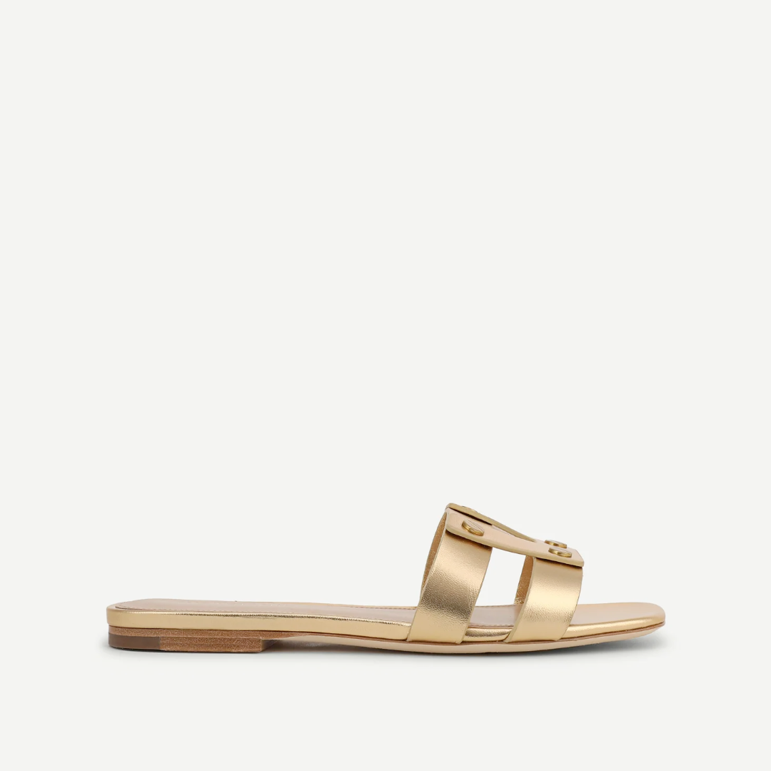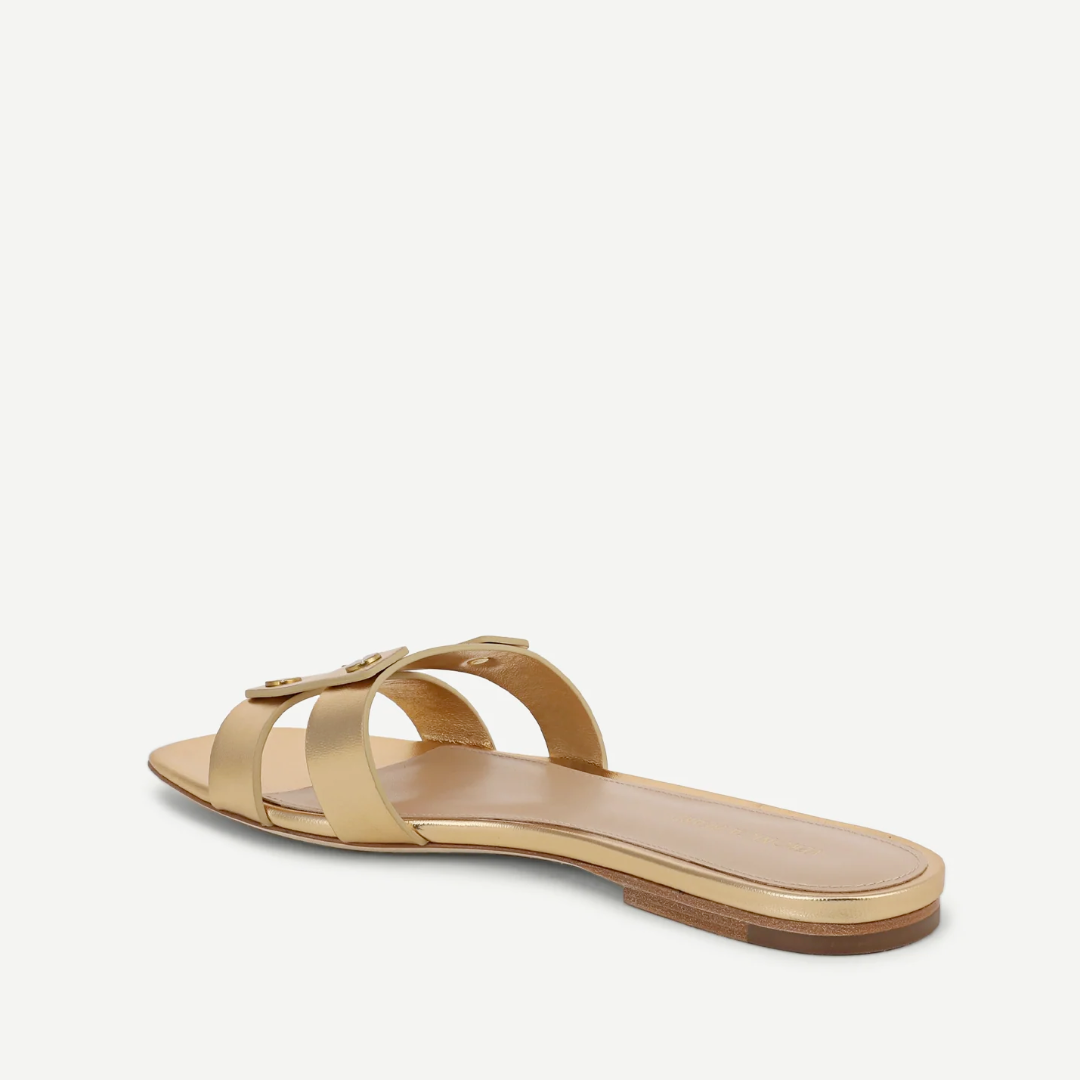 The quintessential sandal every wardrobe needs. Expertly crafted from gold metallic leather, the Via open-toe slide features a minimal multi-strap silhouette, punctuated with gold hardware. Equal parts polished and effortless, it’s the shoe that goes with everything—day to night, week to weekend.