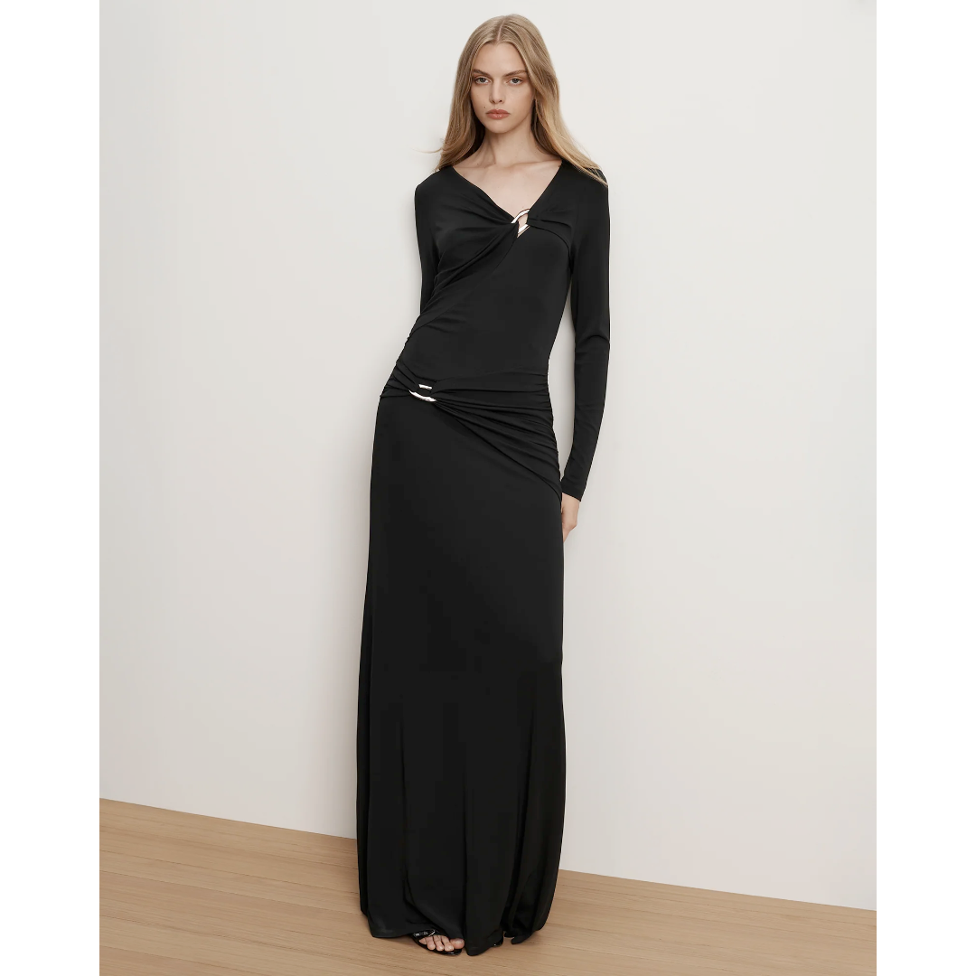 Designed to turn heads. Crafted from black stretch jersey, the Viela maxi dress features a sleek, body-skimming silhouette with artful draping at the asymmetrical neckline and waist, punctuated by sculptural silver O-ring details. Equally cool and elegant, it's best finished with a simple, sky-high heel.