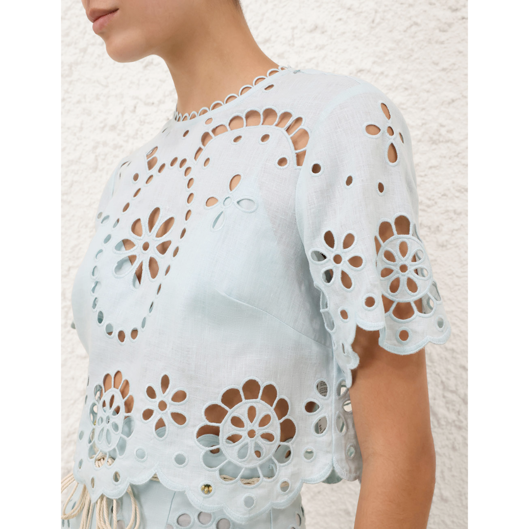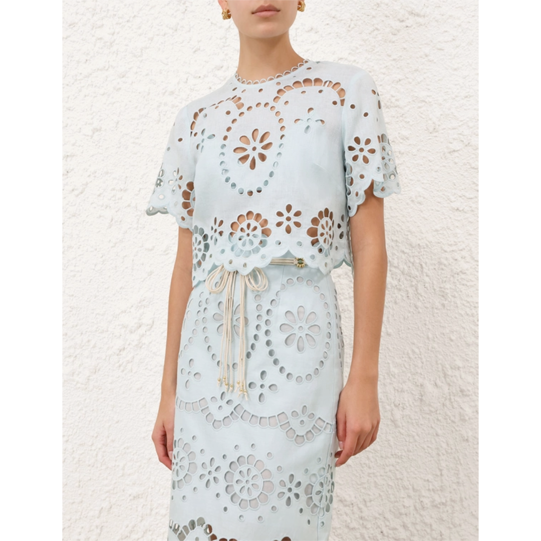 The Awaken Embroidered Bodice in Mint from our Resort Swim 2026 Collection. A linen top featuring short sleeves, an invisible centre back zip closure and scalloped trim at the sleeve cuffs and hem.