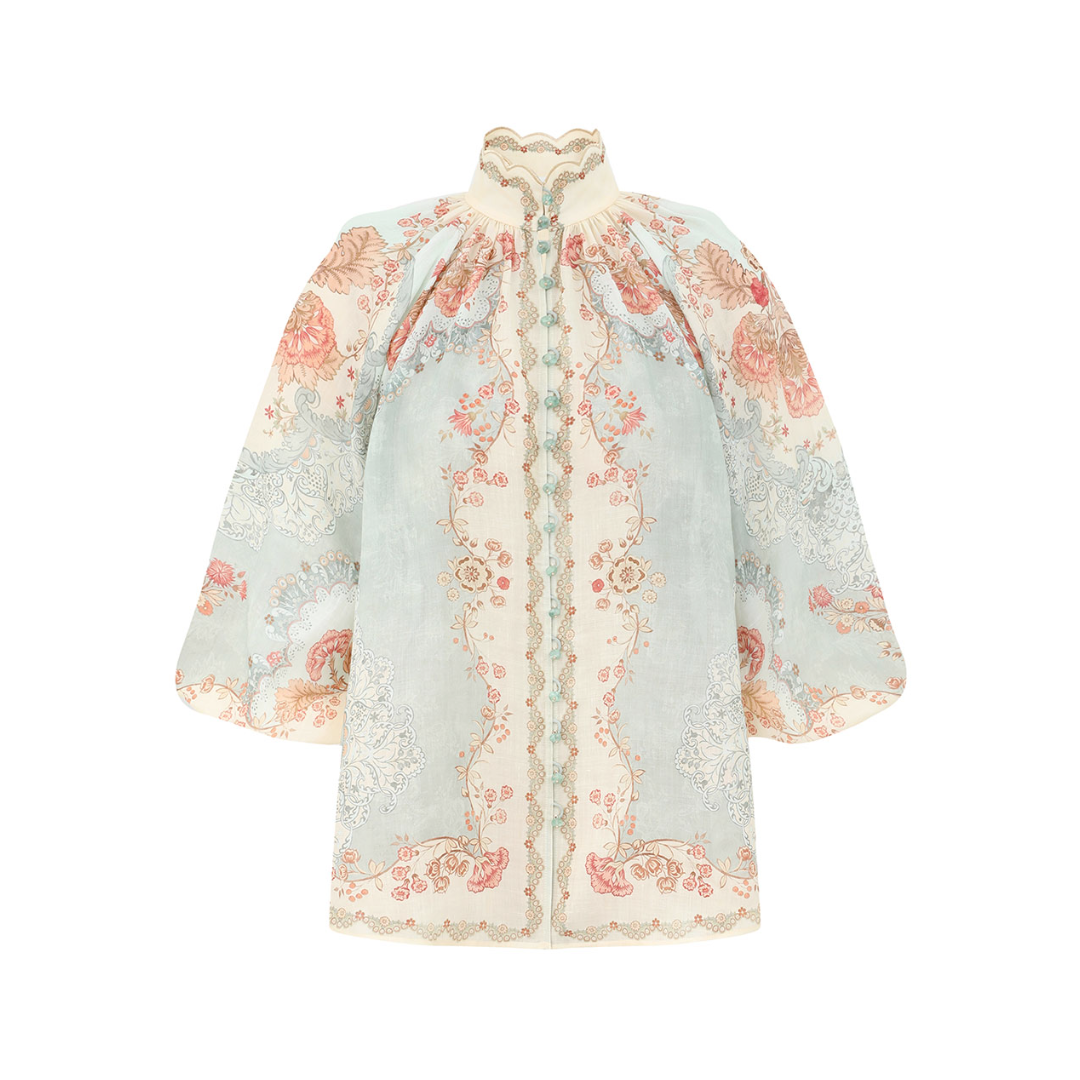The Daylight Blouse in Wallpaper Floral Mint from our Resort Swim 2026 Collection. A ramie blouse featuring a stand collar with scalloped trim, rouleau buttons down the centre front and long sleeves with elasticated cuffs.