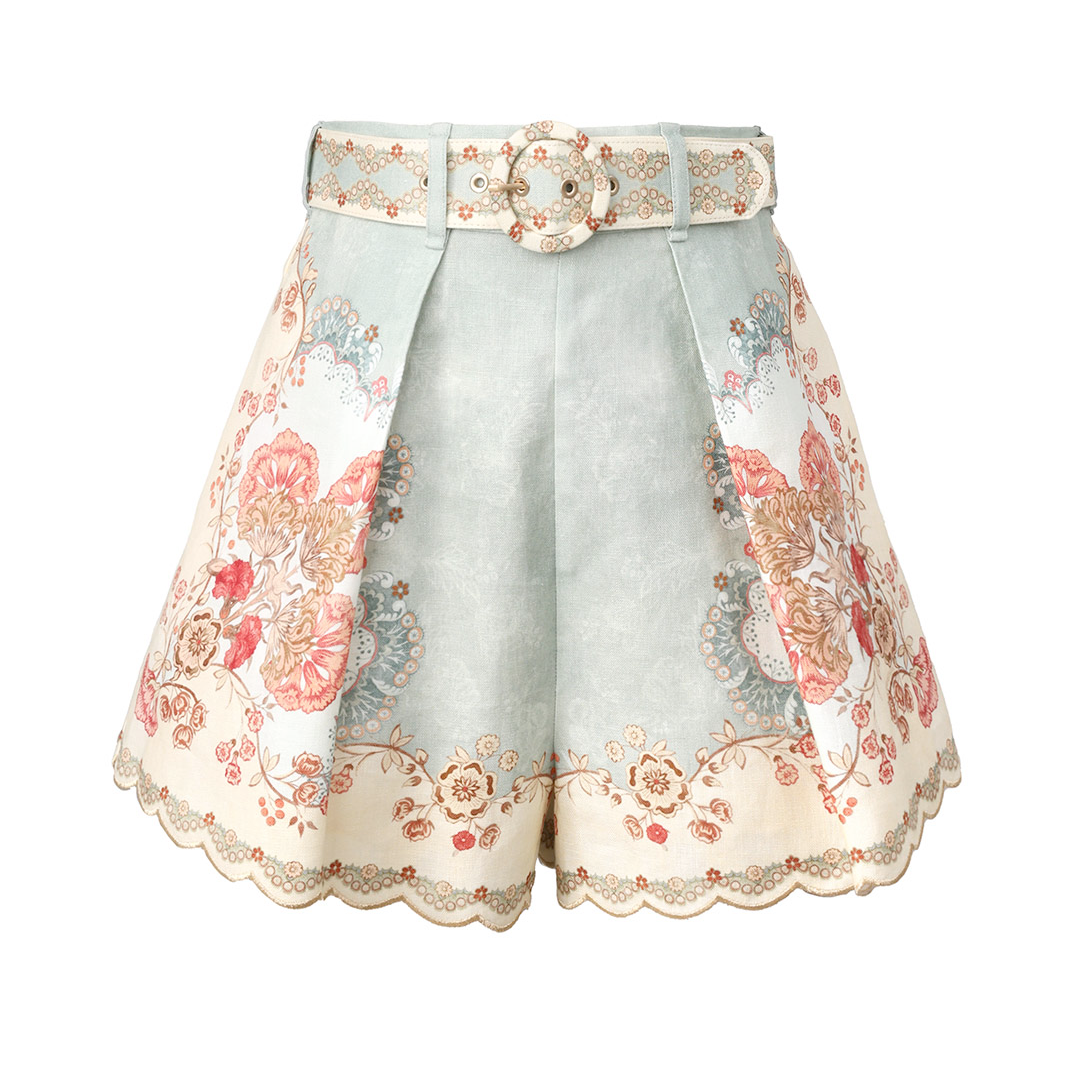 The Daylight Tuck Short in Wallpaper Floral Mint from our Resort Swim 2026 Collection. A placement printed linen short featuring side seam pockets and removable self-covered waist belt.