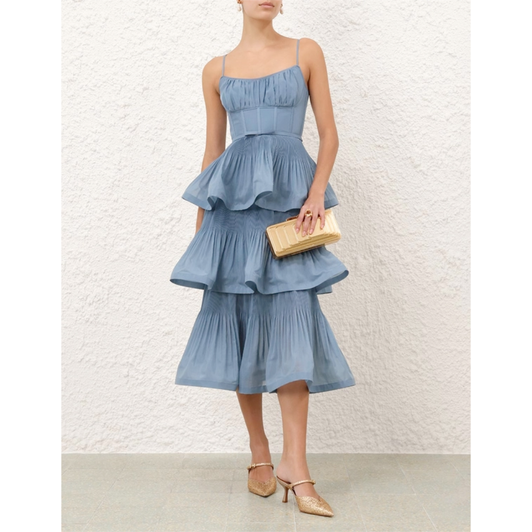 The Pleated Tiered Midi Dress in Deep Blue from our Cruise 2026 Collection, Twisted Romance. A midi-length dress featuring a scoop neckline, adjustable straps, finished with a corset bodice and tiered pleats throughout.