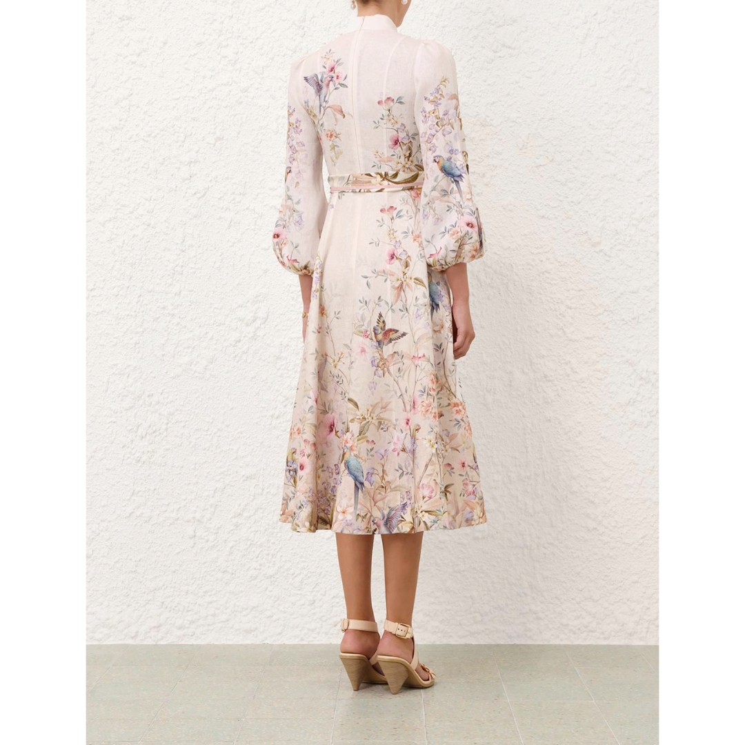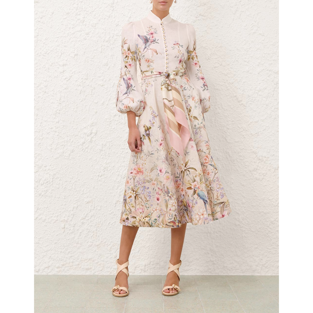 The Rebellion Button Midi Dress in Cream Aviary from our Cruise 2026 Collection, Twisted Romance. A linen midi dress featuring long blouson sleeves with elasticated cuffs, functional front buttons, finished with a removable scarf belt.