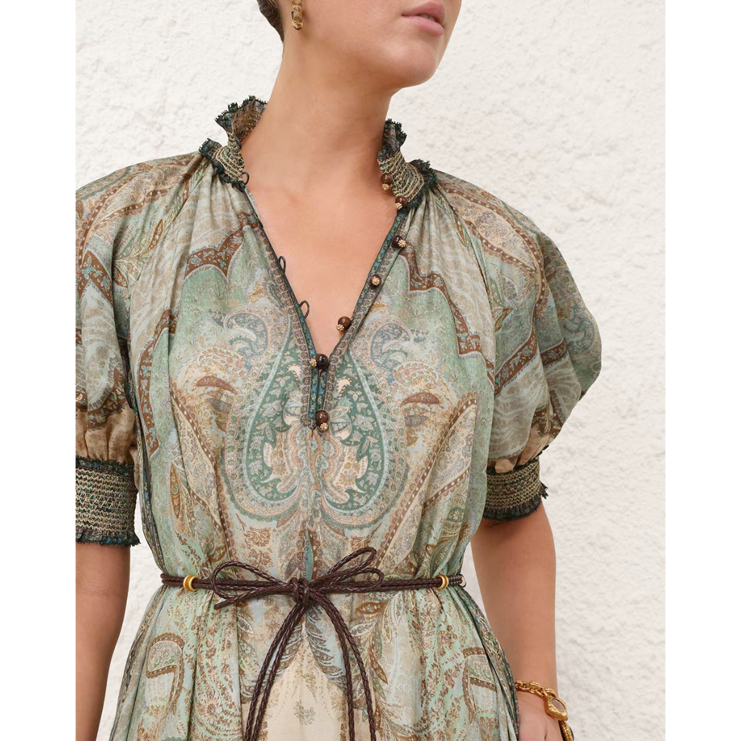 The Wanderlust Billow Dress in Tapestry Teal Multi from our Resort Swim 2026 Collection. A silk maxi dress featuring a shirred stand collar, short billowed sleeves, finished with functional side pockets and frill trim.